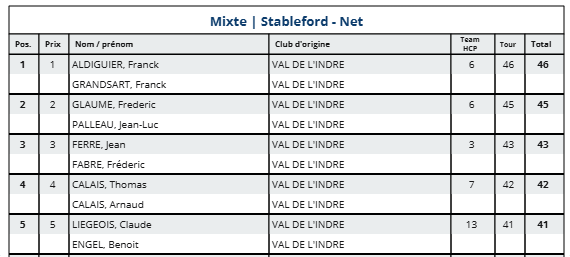 En brut c'est la paire F. ALDIGUIER - F. GRANDSART qui s'impose, tandis que le net est remporté par le tandem F. GLAUME-JL PALLEAU