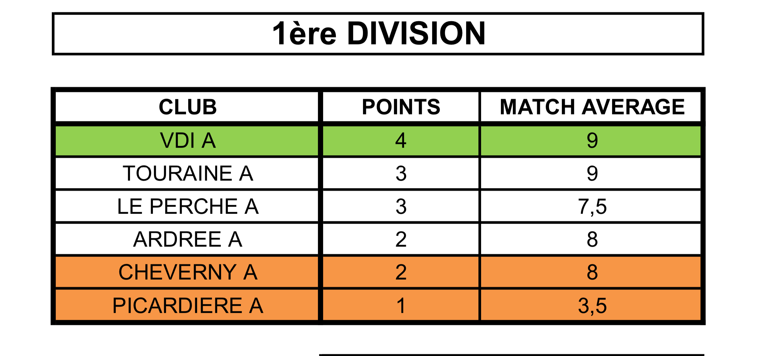 Il nous reste un match à jouer en retard contre Bourges B (4 défaites) à Villedieu lundi prochain 14/4. Avec une probable victoire, nous terminons premiers ex-aequo, seulement battus au point-average général (bien que nous ayons battu le premier, Perche A, sur son terrain).