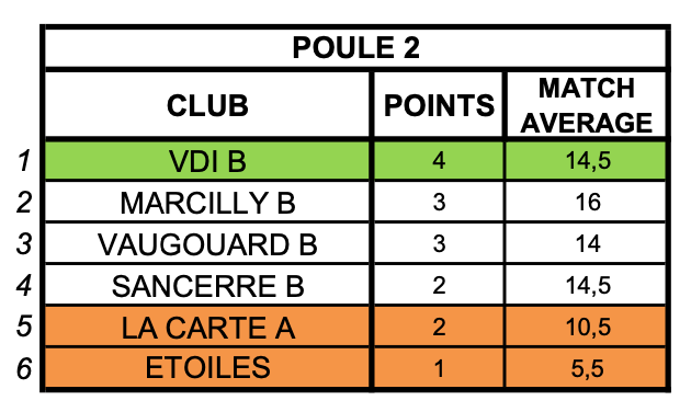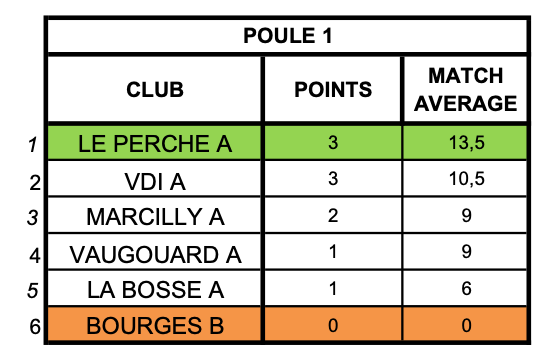 Ce championnat interclubs seniors 1ère division 2025 est clos. Nous terminons premiers ex-aequo. Bien que vainqueur de LE PERCHE sur leur terrain, ils sont déclarés vainqueurs grâce à un meilleur match-average général (13,5 à 10,5). Dommage !