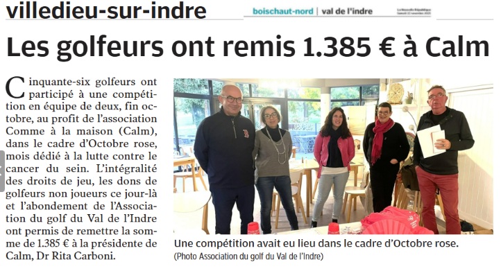 Le samedi 22 novembre, le quotidien "La Nouvelle République" a publié un article mettant en valeur la générosité des golfeurs du Val de l'Indre.
