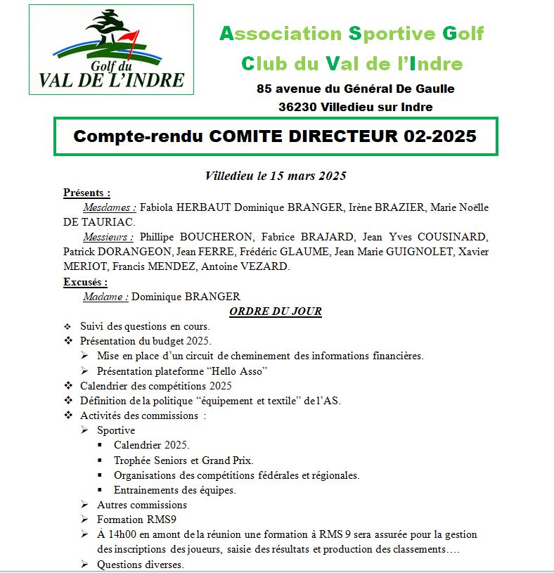 Veuillez trouver ci joint le compte rendu du comité directeur du 15 mars 2025