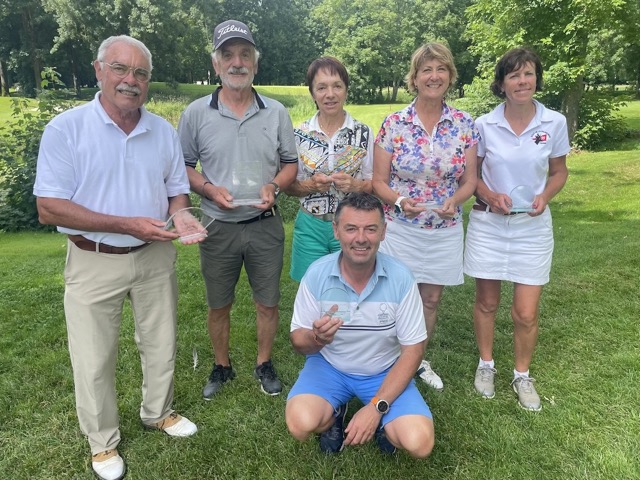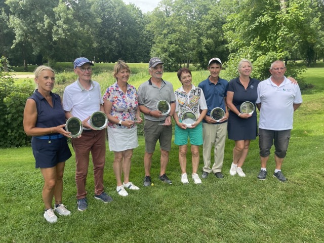 Le Trophée seniors ASGCVI 2024 a livré son verdict. Sous un chaud soleil estival et sur un magnifique terrain de golf superbement préparé par l'équipe des jardiniers de Serge Caboche, une quarantaine de joueurs(ses) a bataillé pour tenter de remporter ce beau challenge golfique. Cette petite assemblée a déçu l'équipe d'organisation qui avait mis les petits plats dans les grands. Cette faible participation demande une réflexion future sur le positionnement de la date dans le calendrier : une concentration de compétitions aux alentours concurrençant défavorablement notre tournoi. Chez les dames, les joueuses locales ont fait la loi, Pascale Hammassi remporte le trophée devant Irène Brazier et Saintillan Florence (golf de la Picardière). Chez les messieurs, Valarino Henry (golf de Divonne) devance d'un coup le toujours jeune Jean Ferré (qui réalise le meilleur score du deuxième tour avec un joli 76), Stéphane Moity (Golf de la Jonchère) terminant à la troisième place. Notre trophée servait également de support au trophée régional seniors de la Ligue du Centre-Val de Loire (voir la photo réunissant les lauréats)